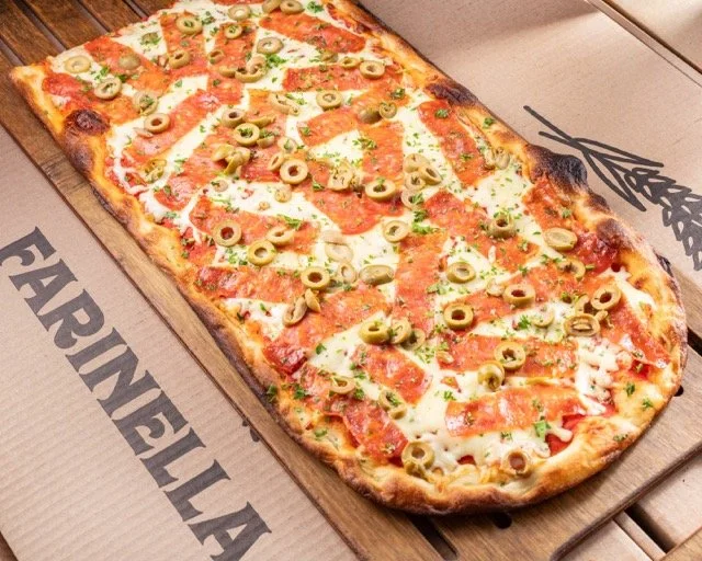 Raw crushed tomato sauce, Australian mozzarella, slices of spicy salamino, sliced green olives, sprinkled parsley and drizzled with olive oil