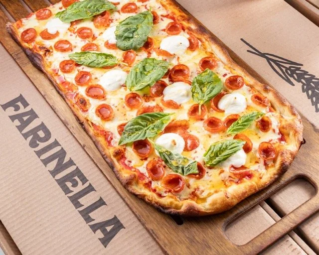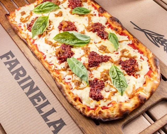 Raw crushed tomato sauce, Australian mozzarella, fiery 'nduja, caramelized onions, fresh basil and drizzled with olive oil
