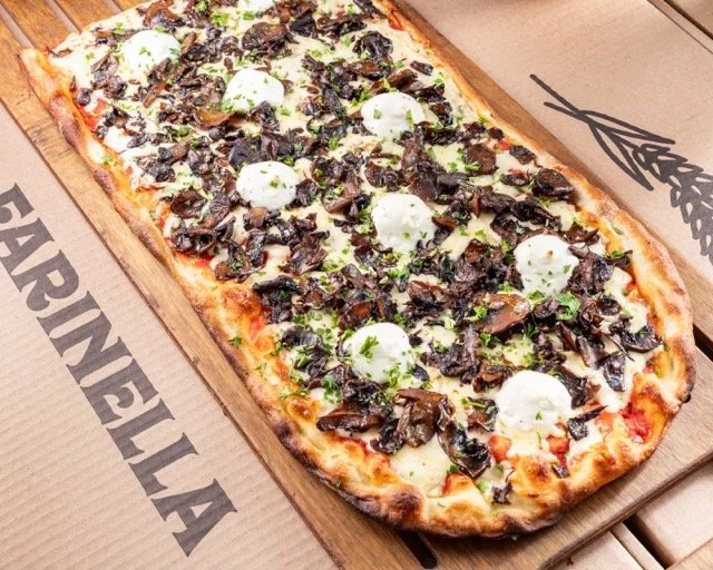 Raw crushed tomato sauce, rosemary white wine roasted mushrooms, Australian mozzarella, dollops of whipped ricotta and drizzled with olive oil